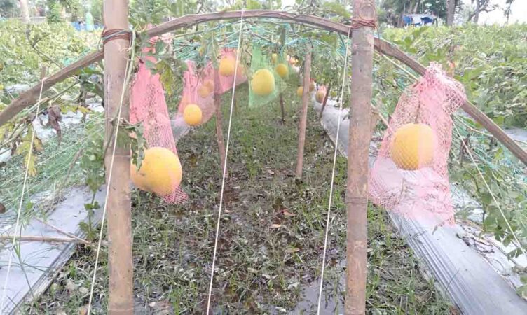 মাচার ওপর সবুজ পাতা ছেয়ে আছে। আর নিচের দিকে ঝুলছে কালো ও সোনালী রঙের ছোট-বড় তরমুজ। গাছ থেকে যেন ছিড়ে না যায় জন্য প্রতিটি তরমুজ নেটের মধ্যে রাখা হয়েছে। এমন দৃশ্য পাকুড়িয়া গ্রামের মাঠে তরমুজের ক্ষেত। ভিয়েতনামের গোল্ডেন ক্রাউন (সোনালী) ও ব্ল্যাকবেবী (কালো) জাতের তরমুজ।