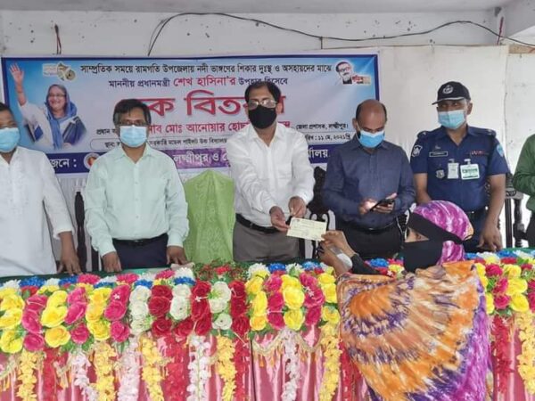 মিজানুর শামীমঃ লক্ষ্মীপুরের কমলনগর ও রামগতি উপজেলায় সাম্প্রতিক সময়ে মেঘনা নদীর ভাঙ্গনে নিঃস্ব, অসহায় ও দুস্থ ১০০টি পরিবারের মাঝে মাননীয় প্রধানমন্ত্রীর ঈদ উপহার হিসেবে ৫’০০০/= টাকা করে মোট ৫’০০’০০০/= টাকার চেক দেয়া হয়। এছাড়া করোনায় ক্ষতিগ্রস্ত অসহায় ১০০ মানুষের মাঝে নগদ জনপ্রতি ৫’০০/= টাকা করে মোট ৫০’০০০/= টাকা বিতরণ করা হয়।