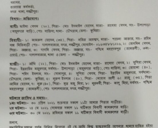 তাছাড়া গত ২৪মে সকাল ১১ ঘটিকায় যৌতুকের জন্য স্বামী ও খালা শ্বাশুরী মিলে শারীরিকভাবে মারধর করে ভয়ভীতি দেখিয়ে জোরপূর্বক তিনশত টাকার নন জুডিশিয়াল খালি স্টাম্পে ভুক্তভোগীর স্বাক্ষর করিয়ে নেয়। এছাড়া গত রবিবার সকাল ১১ টায় ভুক্তভুগি তার বাবার বাড়ি হইতে স্বামী কামরুলের খালার বাড়ি লক্ষ্মীপুর সদর উপজেলার দালাল বাজার ইউনিয়নের মহাদেবপুরে এলাকায় স্বামীর খোঁজে যায়। এসময় বাস পরিবহন শ্রমিক স্বামীকে না পেয়ে খালা শাশুড়ির নিকট জানতে চাইলে তারা মা-মেয়ে (নানী শ্বাশুড়ি ও খালা শ্বাশুড়ি) দুজনে মিলে বাপের বাড়ী থেকে বিবাদীদের জন্য যৌতুকের টাকা নিয়ে না আসায় বাদীকে বেদম মারধর করলে সে লক্ষ্মীপুর সদর হাসপাতালে জরুরি বিভাগে গিয়ে চিকিৎসা নেয়।
