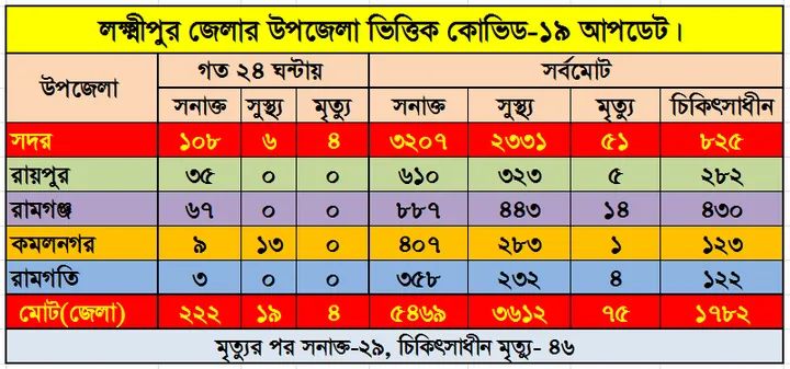 সিভিল সার্জনের কার্যালয় সূত্রে জানা যায়, গত ২৪ ঘণ্টায় সবচেয়ে বেশি করোনা আক্রান্ত হয়েছে সদর উপজেলায় ১০৮জন। এছাড়া রামগঞ্জে ৬৭ জন, রায়পুরে ৩৫ জন, কমলনগরে ৯ জন ও রামগতিতে ৩ জন করোনা শনাক্ত হয়েছে।