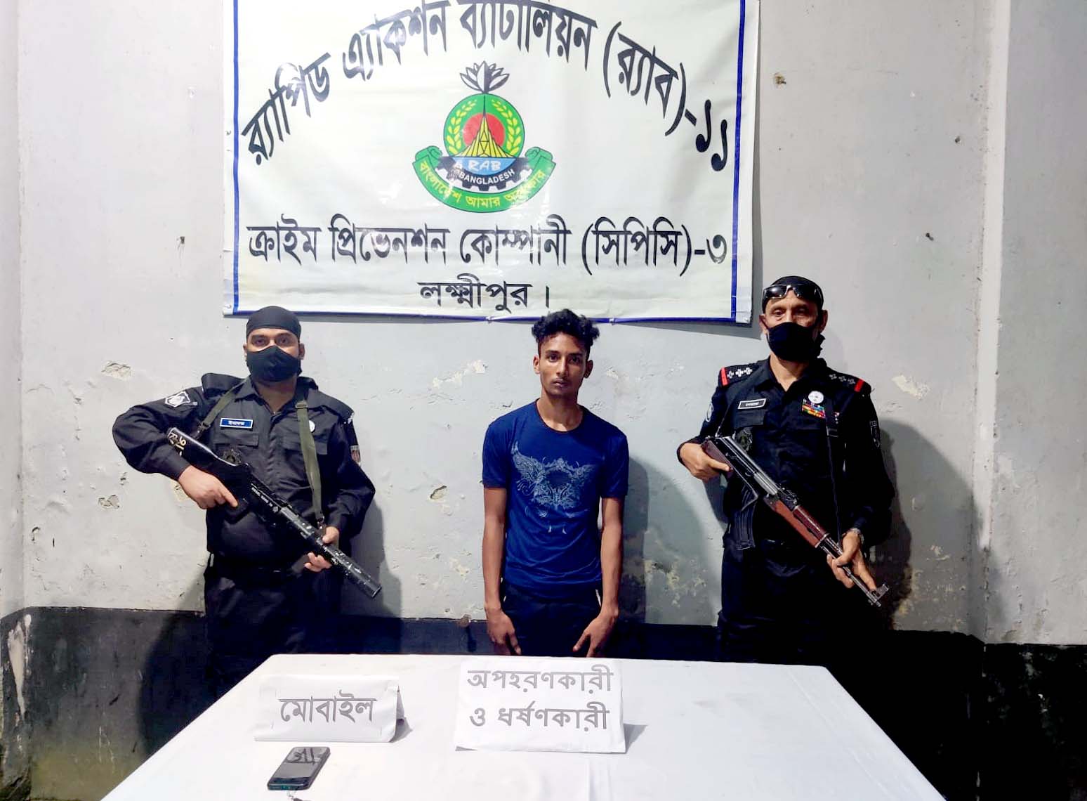 র্যাব-১১, সিপিসি-৩ লক্ষ্মীপুর ক্যাম্পের কোম্পানী কমান্ডার এ এস পি খন্দকার মোঃ শামীম হোসেন বুধবার বিকেলে এক প্রেস বিজ্ঞপ্তিতে জানান, গত ১২ আগস্ট সকাল ৯টার দিকে লক্ষ্মীপুর সদর উপজেলার রতনপুর গ্রামের জালাল মিয়ার ব্রিজ এলাকা থেকে পূর্ব পরিকল্পিতভাবে গৃহবধুকে অপহরণ করে।