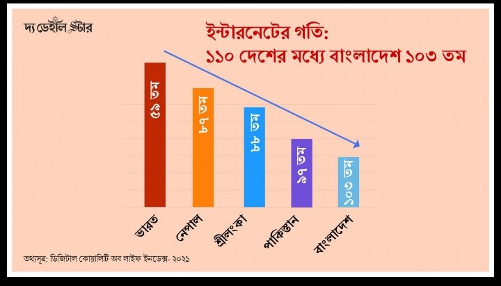 নিজস্ব প্রতিনিধিঃ ডিজিটাল কোয়ালিটি অব লাইফ ইনডেক্স ২০২১ অনুযায়ী, বিশ্বের ১১০টি দেশের মধ্যে বাংলাদেশের মোবাইল ইন্টারনেট গতি সবচেয়ে কম। ১১০ টি দেশের মধ্যে বাংলাদেশের সার্বিক র্যাংকিং ১০৩ তম।