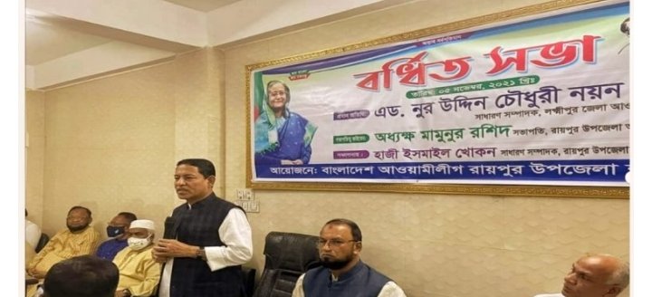 রায়পুরে উপজেলা আ’লীগের সভাপতি ও উপজেলা চেয়ারম্যান অধ্যক্ষ মামুনুর রশিদের কার্যালয়ে বর্ধিত সভায় সভাপতিত্বে বক্তব্য দেন, সাধারন সম্পাদক হাজি ইসমাইল খোকন, সহসভাপতি মোঃ শাহজাহান, যুগ্ম সাধারণ হারুনুর রশিদ, সাংগঠনিক সম্পাদক কাজি নাজমুল কাদের গুলজার, এডভোকেট ইউসুফ জালাল কিসমত, সাবেক মেয়র রফিকুল হায়দার বাবুল পাঠান, সাবেক উপজেলা চেয়ারম্যান আলতাফ হোসেন মাষ্টার ও মুক্তিযোদ্ধা শহীদ উল্যা বিএসসি।