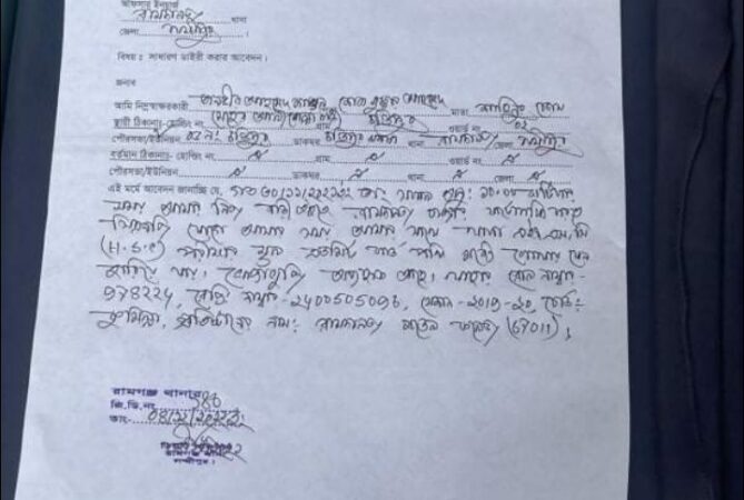 আমার উচ্চ মাধ্যমিক (ব্যবসা ব্যবস্হাপনা) পরীক্ষার ২য় বর্ষের এডমিট কার্ড হারিয়েছে। বাংলাদেশ কারিগরি শিক্ষা বোর্ড ঢাকা এর সিরিয়াল নং- ২১২২৩৫০৮৬, রোল নং- ৯৭৮২২৪, রেজি. নং- ২৪০০৫০৫০৯৬ শিক্ষাবর্ষঃ ২০১৯-২০। রামগঞ্জ মডেল কলেজ কোড নং- ৬৭০১১। রামগঞ্জ থানার জিডি নং- ১৪০, তারিখ- ০৪-১২-২০২১।