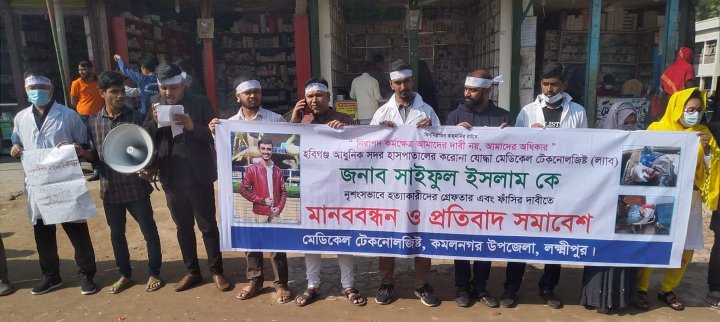 মানববন্ধনে উপস্থিত মেডিকেল টেকনোলজিস্টগণ করোনা যোদ্ধা সাইফুল ইসলাম হত্যাকারীদের আগামী ২৪ ঘন্টার মধ্যে গ্রেফতার করে আইনের আওতায় আনার দাবীসহ সর্বোচ্চ শাস্তি ফাঁসির দাবী জানান। বেঁধে দেয়া সময়ের মধ্যে সাইফুল হত্যাকারীদের গ্রেফতার করা না হলে হুঁশিয়ারি দিয়ে বক্তারা বলেন, কমলনগরসহ সারাদেশের মেডিকেল টেকনোলজিস্টরা অনির্দিষ্টকালের জন্য কর্মবিরতি ও সকল মেডিকেল টেকনোলজিস্ট ও চিকিৎসক, নার্স, স্বাস্থ্যকর্মীদের সাথে নিয়ে কঠোর আন্দোলন করা হবে বলে তারা জানান। উপস্থিত তানভীর আহমেদ বলেন, সাইফুল হত্যাকারীদের গ্রেফতার করা না হলে সকলকে নিয়ে আমরণ অনশন করা হবে। তিনি আরও বলেন, মানবতার মা জননেত্রী প্রধানমন্ত্রী শেখ হাসিনার কাছে আমাদের সাধারন মেডিকেল টেকনোলজিস্টদের দাবী মেডিকেল টেকনোলজিস্টরা আপনার সন্তান। সম্মুখসারির যোদ্বা। যারা নিজেদের জীবনের তোয়াক্কা না করে করোনাকালীন সময় থেকে নিজের ও পরিবারের কথা চিন্তা না কাজ করে চলেছ।