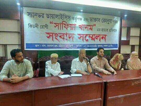 চট্টগ্রামে স্যানডর ডায়ালাইসিস সার্ভিস বাংলাদেশ প্রাইভেট লিমিটেড’র ডাক্তার রেহনুমা ও তার সঙ্গীয় নার্স/টেকনেশিয়ানদের চিকিৎসা জনিত স্বেচ্ছাচারিতা অবহেলা এবং মেডিকেল শিক্ষার চরমপন্থী আচরণের কারণে কিডনি রোগী সাফিয়া খানম নামের অসহায়ের মৃত্যুর প্রতিবাদে সাংবাদিক সম্মেলন অনুষ্ঠিত হয়।