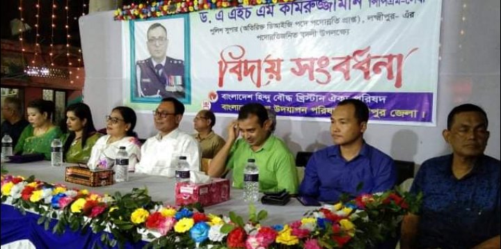 ভাস্কর মজুমদার (নিজস্ব প্রতিবেদক); হিন্দু-বৌদ্ধ-খ্রিস্টান ঐক্য পরিষদ ও বাংলাদেশ পূজা উৎযাপন পরিষদ লক্ষ্মীপুরের পক্ষ থেকে জেলা পুলিশ সুপারের দায়িত্বরত অতিরিক্ত উপ মহাপরিদর্শক ড. এএইচএম কামরুজ্জামানকে বিদায় সংবর্ধনা দেয়া হয়েছে। ১৭ আগস্ট বুধবার রাত আটটার দিকে শহরের শ্রীশ্রী শ্যামসুন্দর জিউ মন্দিরে জেলার সকল থানার হিন্দু-বৌদ্ধ-খ্রিস্টান ঐক্য পরিষদ ও বাংলাদেশ পূজা উৎযাপন পরিষদের নেতৃবৃন্দের উপস্থিতিতে এ সংবর্ধনা দেয়া হয়। এসময় বক্তারা বলেন, লক্ষ্মীপুর জেলা পুলিশ সুপার পদে ড. এএইচএম কামরুজ্জামান সাহেব তিন বছর দায়িত্ব পালন কালে তিনি আমাদের সংখালঘু সম্পাদয়কে নিশ্চিত নিরাপত্তা দেন। এ কারনে আমরা হিন্দু-বৌদ্ধ- খ্রিস্টানরা উনার ভবিষ্যৎ মঙ্গল কামনা করি। একজন সৎ, কর্মঠ ও দক্ষ পুলিশ কর্মকর্তার প্রতি চির কৃতজ্ঞ জানিয়ে তারা তার দীর্ঘায়ায়ু ও চাকরি জীবনে আরও পদোন্নতি কামনা করেন।