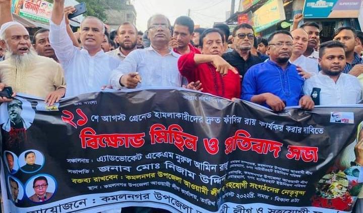 ভাস্কর মজুমদার (নিজস্ব প্রতিবেদক); রাজধানী ঢাকার বঙ্গবন্ধু এভিনিউস্হ আওয়ামী লীগের কেন্দ্রীয় কার্যালয়ের সামনে ২০০৪ সনের ২১ আগস্ট ভয়াবহ গ্রেনেড হামলার প্রতিবাদে লক্ষ্মীপুরের কমলনগরে আওয়ামীলীগ ও এর অঙ্গ সংগঠনের উদ্যোগে প্রতিবাদ সভা ও বিক্ষোভ মিছিল হয়েছে। ২১ আগস্ট রোববার বিকেলে উপজেলার প্রানকেন্দ হাজিরহাট বাজারে বিক্ষোভ মিছিল ও প্রতিবাদ সভায় স্হানীয় আওয়ামী লীগ, যুবলীগ, ছাত্রলীগ, স্বেচ্ছা সেবকলীগ, শ্রমিকলীগ, কৃষক লীগসহ সকল অঙ্গসংগঠনের বিপুলসংখ্যক নেতাকর্মীরা উপস্থিত ছিলেন।