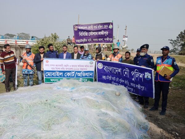 বুধবার ৪ জানুয়ারি সকাল থেকে থেকে দুপুর পর্যন্ত লক্ষ্মীপুর জেলা ও সদর উপজেলা মৎস্য বিভাগ এবং নৌপুলিশ যৌথভাবে মজু চৌধুরীর হাট মেঘনা নদীর কয়েকটি পয়েন্ট থেকে অবৈধ ১লক্ষ ৫০ হাজার মিটার কারেন্ট জাল,৮টি মশারীজাল , ২হাজার মিটার চরঘেরা জাল জব্দ করেন।
