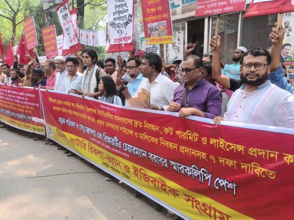 এর আগে সকালে একই দাবীতে বিক্ষোভ মিছিল বের করে ব্যাটারি চালিত অটোরিকশা, ইজিবাইক সংগ্রাম পরিষদ। মিছিলটি ঢাকা বিশ্ববিদ্যালয়, কেন্দ্রীয় শহীদ মিনার ও হাই কোর্ট এলাকা সহ রাজধানীর গুরুত্বপূর্ণ এলাকা প্রদক্ষিণ শেষে জাতীয় প্রেসক্লাবের সামনে সমাবেশে মিলিত হয়।