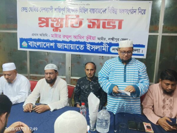 প্রেস বিজ্ঞপ্তিঃ আগামী ৩০ জুলাই’২৩ বাংলাদেশ জামায়াতে ইসলামী কেন্দ্র ঘোষিত কর্মসূচি বাস্তবায়নের লক্ষ্যে প্রস্তুতি ও সমন্বয় সভা অনুষ্ঠিত হয়েছে। জেলা জামায়াতের সেক্রেটারী ও বিক্ষোভ মিছিল বাস্তবায়ন কমিটির আহবায়ক মাওলানা ফারুক হোসাইন নুরনবীর সভাপতিত্বে ও জেলা সহকারী সেক্রেটারি এডভোকেট মহসিন কবির মুরাদ এর সঞ্চালনায় প্রধান অতিথি হিসেবে উপস্থিত ছিলেন জেলা নায়েবে আমীর এডভোকেট নজির আহমদ। অন্যান্যের মধ্যে বক্তব্য রাখেন জেলা নায়েবে আমীর এ আর হাফিজ উল্লাহ, সহকারী সেক্রেটারি মাওলানা নাসির উদ্দিন মাহমুদ, জেলা শ্রমিক কল্যাণ ফেডারেশনের সভাপতি মমিন উল্লাহ পাটওয়ারী, জেলা যুব বিভাগের সভাপতি এম সামছুল ইসলাম, শহর জামায়াতের আমীর অধ্যক্ষ আবুল ফারাহ নিশান ও শহর ছাত্রশিবিরের সভাপতি আরমান পাটওয়ারী। অন্যান্যের মধ্যে উপস্থিত ছিলেন জেলা কর্মপরিষদ সদস্য মাওলানা সর্দার সৈয়দ আহমদ, অধ্যাপক আবদুর রহমান, জেলা শিবিরের সভাপতি সাইফুর রহমান রাকিব, শহর জামায়াতের সেক্রেটারি মাওলানা জহিরুল ইসলাম, রায়পুর উপজেলা সেক্রেটারী এড. আব্দুল আউয়াল রাসেল, চন্দ্রগঞ্জ থানা সেক্রেটারী রেজাউল ইসলাম খান সুমন, সদর উপজেলা সেক্রেটারী ফয়েজ আহমদ, লক্ষ্মীপুর বারের সাবেক সভাপতি এডভোকেট শাহাদাত হোসেনসহ বিভিন্ন উপজেলা পৌরসভা ও পেশাজীবি নেতৃবৃন্দ। নেতৃবৃন্দ বলেন এই কর্মসূচি কেয়ারটেকার সরকার পূন:প্রতিষ্ঠা, দ্রব্যমূল্যের লাগামহীন উর্ধগতি, আমীরে জামায়াত সহ রাজনৈতিক নেতৃবৃন্দ ও ওলামায়ে কেরামের মুক্তির দাবীতে। যাহা একান্তই দেশ ও জনগণের স্বার্থের সাথে সংশ্লিষ্ট। তাই উক্ত মিছিলে অংশগ্রহণ করার জন্য লক্ষ্মীপুরের সকল ব্যবসায়ী, শিক্ষক, পেশাজীবি, আইনজীবী ও শ্রমজীবীসহ সকল শ্রেণী পেশার জনসাধারণের প্রতি আহবান জানান এবং শান্তিপূর্ণ এই মিছিল বাস্তবায়নে প্রশাসনের সার্বিক সহযোগিতা কামনা করেন।