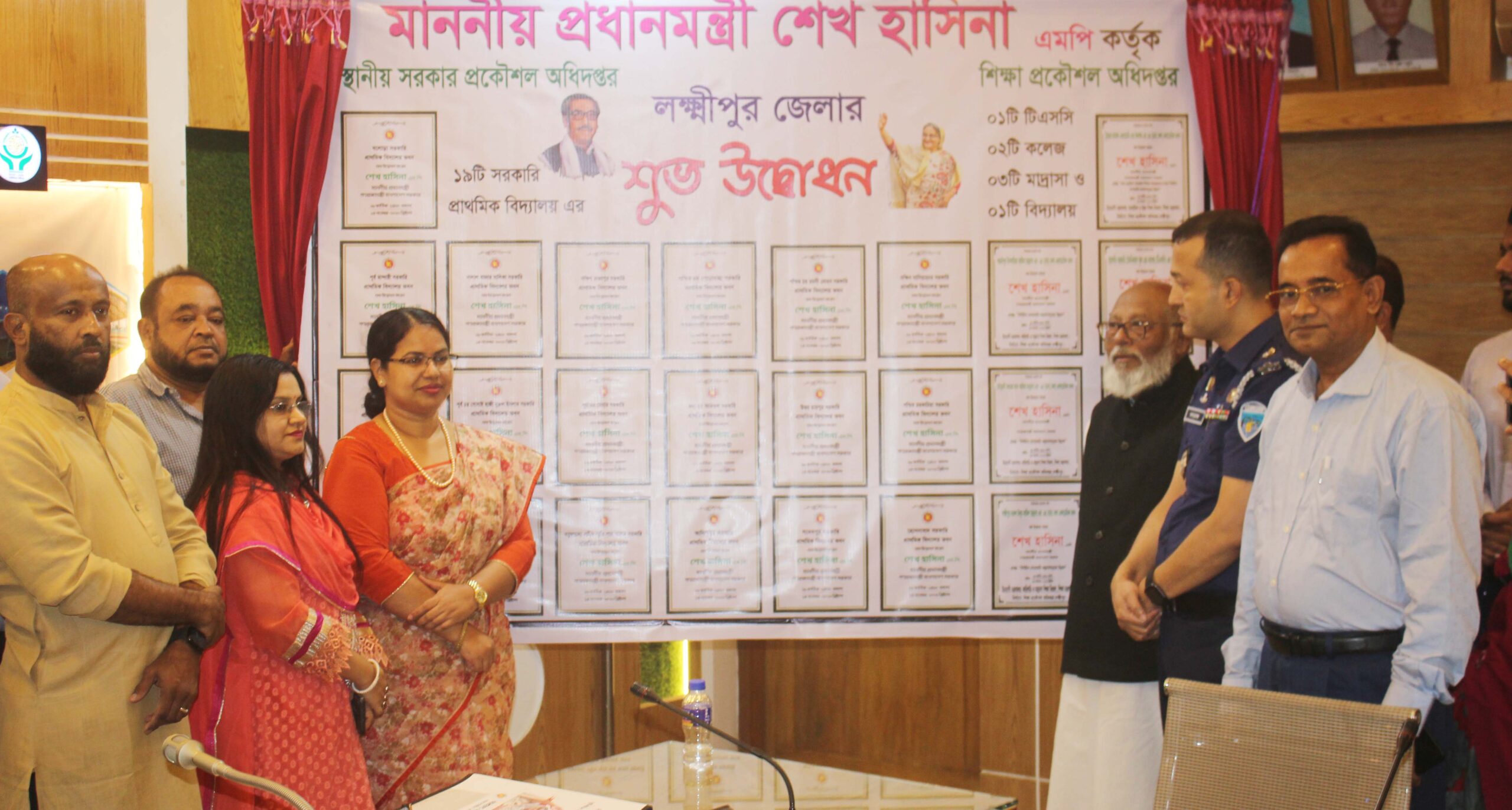 পরে জেলা প্রশাসক সম্মেলন কক্ষে আয়োজিত অনুষ্ঠানে ফলক উন্মোচন করেন লক্ষ্মীপুর জেলা প্রশাসক সুরাইয়া জাহান, পুলিশ সুপার মোহাম্মদ তারেক বিন রশিদ, জেলা পরিষদ চেয়ারম্যান বীর মুক্তিযোদ্ধা মো: শাহজাহান, জেলা পরিষদের প্রধান নির্বাহী কর্মকর্তা মোহাম্মদ রেজাই রাফিন সরকার,অতিরিক্ত জেলা প্রশাসক রাজস্ব সাজিয়া পারভীন, অতিরিক্ত জেলা প্রশাসক সার্বিক মেহের নিগার,সদর উপজেলা চেয়ারম্যান একে এম সালাহ উদ্দিন টিপু, উপজেলা নির্বাহী অফিসার আরিফুর রহমান,লক্ষ্মীপুরের এলজিইডি নির্বাহী প্রকৌশলী ইকরামুল হক,শিক্ষা প্রকৌশল অধিদপ্তরের নির্বাহী প্রকৌশলী শ্রাবণী চক্রবর্তী প্রমুখ।