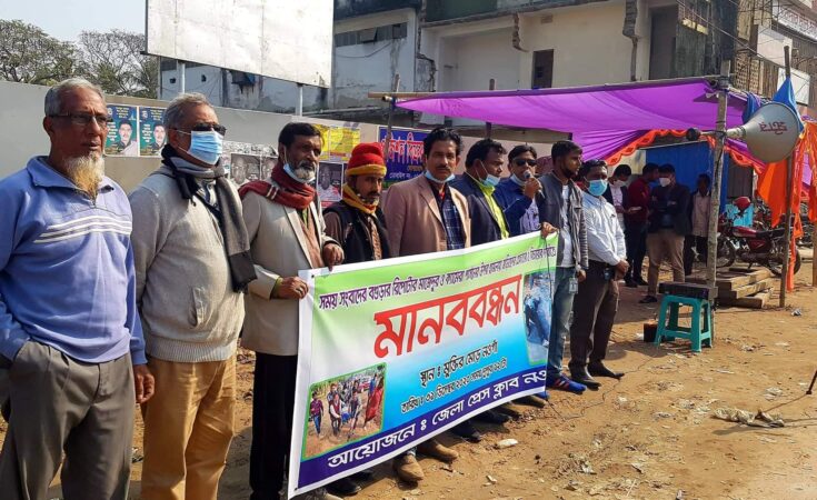 আজ বৃহস্পতিবার দুপূরে জেলা প্রেসক্লাবের উদ্যোগে শহরের মুক্তির মোড়ে এই কর্মসূচী পালন করা হয়।