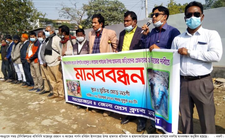 বগুড়াতে সময় টেলিভিশনের প্রতিনিধি মাজেদুর রহমান ও ক্যামের পার্সন রবিউল ইসলামের উপর হামলার প্রতিবাদ ও হামলাকারিদের গ্রেপ্তারের দাবিতে নওগাঁয় মানববন্ধন অনুষ্ঠিত হয়েছে।