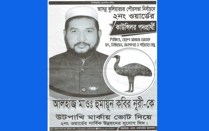 দ্বিতীয় ধাপে আগামী ১৬ জানুয়ারি অনুষ্ঠিত হতে যাচ্ছে কিশোরগঞ্জের কুলিয়ারচর পৌরসভা নির্বাচন। এ নির্বাচনকে ঘিরে শুরু হয়েছে ব্যাপক প্রচার প্রচারণা। এ প্রচারণায় পৌরসভার ২নং ওয়ার্ডের প্রতিদ্বন্দ্বী সাধারণ কাউন্সিলর পদপ্রার্থী আলহাজ্ব মাও: হুমায়ূন কবির নূরী তার নির্বাচনী প্রচারণার প্রধান মাধ্যম পোষ্টারে বাংলাদেশ আওয়ামী লীগের দলীয় প্রতীক নৌকার ছবি ব্যবহার করে ও ওয়ার্ডে একাধিক নির্বাচনি ক্যাম্প তৈরী করে চায়ের আড্ডা বসিয়ে প্রচার প্রচারণা চালিয়ে আচরণবিধি লঙ্ঘন করে আসছে বলে অভিযোগ উঠেছে।