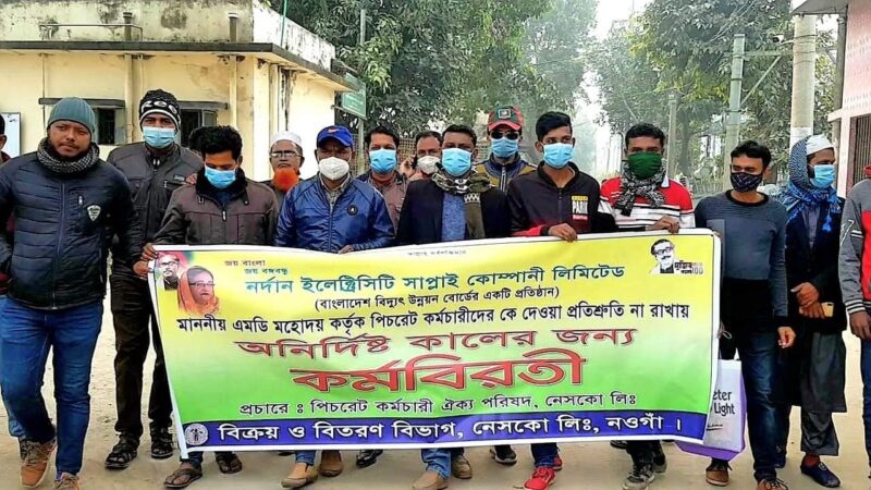 এমতাবস্তায় দীর্ঘদিন থেকে নেসকোতে তাদের চাকুরি স্থায়ী করতে আন্দোলন ও দাবি জানিয়ে আসলেও তা বাস্তাবায় না হওয়ায় কেন্দ্রীয় অংশ হিসেবে রাজশাহী ও রংপুর বিভাগে অস্থায়ী (পিসরেট) কর্মচারী ঐক্য পরিষদ নওগাঁর উদ্যোগে এই কর্মসূচী কর্ম বিরতী পালন করা হয়।