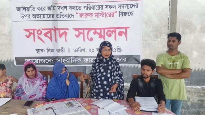 সংবাদ সম্মেলনে তারা স্থানীয় আলিফ বিজ্ঞান এন্ড কারিগরি স্কুল এন্ড কলেজের প্রিন্সিপাল উপজেলার বড়খারচর মহল্লার মরহুম আব্দুর রাশিদের পুত্র মো. ফারুক মিয়া কর্তৃক বিভিন্ন কৌশলে তৈয়ারীকৃর বিভিন্ন জাল দলিল, জাল এনআইডি, বিভিন্ন কর্মকর্তাদের জাল স্বাক্ষরিত সনদের বিভিন্ন কাগজপত্র তুলে ধরে জন্মদাত্রী মা ও ভাই-বোনেরা বলেন, ফারুক মিয়া দীর্ঘ দিন যাবৎ ধরে তাদের জায়গা জমির দাগ খতিয়ান ও চৌহদ্দি ব্যবহার করে জাল দলিল তৈরি করে তাদের জায়গা-জমি জবরদখল করে আসছে। এতে প্রতিবাদ করায় পরিবারের সকল সদস্যদের স্তব্ধ করে রাখার জন্য তাদের নামে ১৯টি মিথ্যা মামলা দিয়ে হয়রানি করে আসছে এবং ফারুক মিয়ার স্কুল ও কলেজের শিক্ষার্থীদের দিয়ে তাদের উপর হামলা, মারধর ও প্রাণনাশের হুমকি দিয়ে বেড়াচ্ছে।